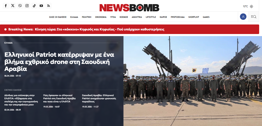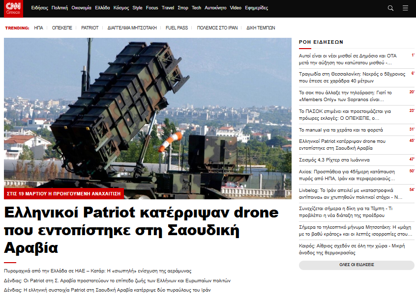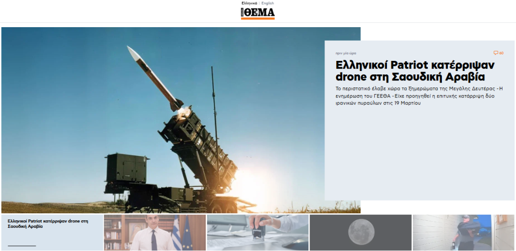 A Hellenic Air Force Patriot air defense system deployed in Saudi Arabia intercepted an unmanned aerial vehicle early Monday, military authorities said. The incident follows a previous engagement on March 19, when Greek Patriot systems shot down two Iranian ballistic missiles targeting oil refineries in Saudi Arabia.