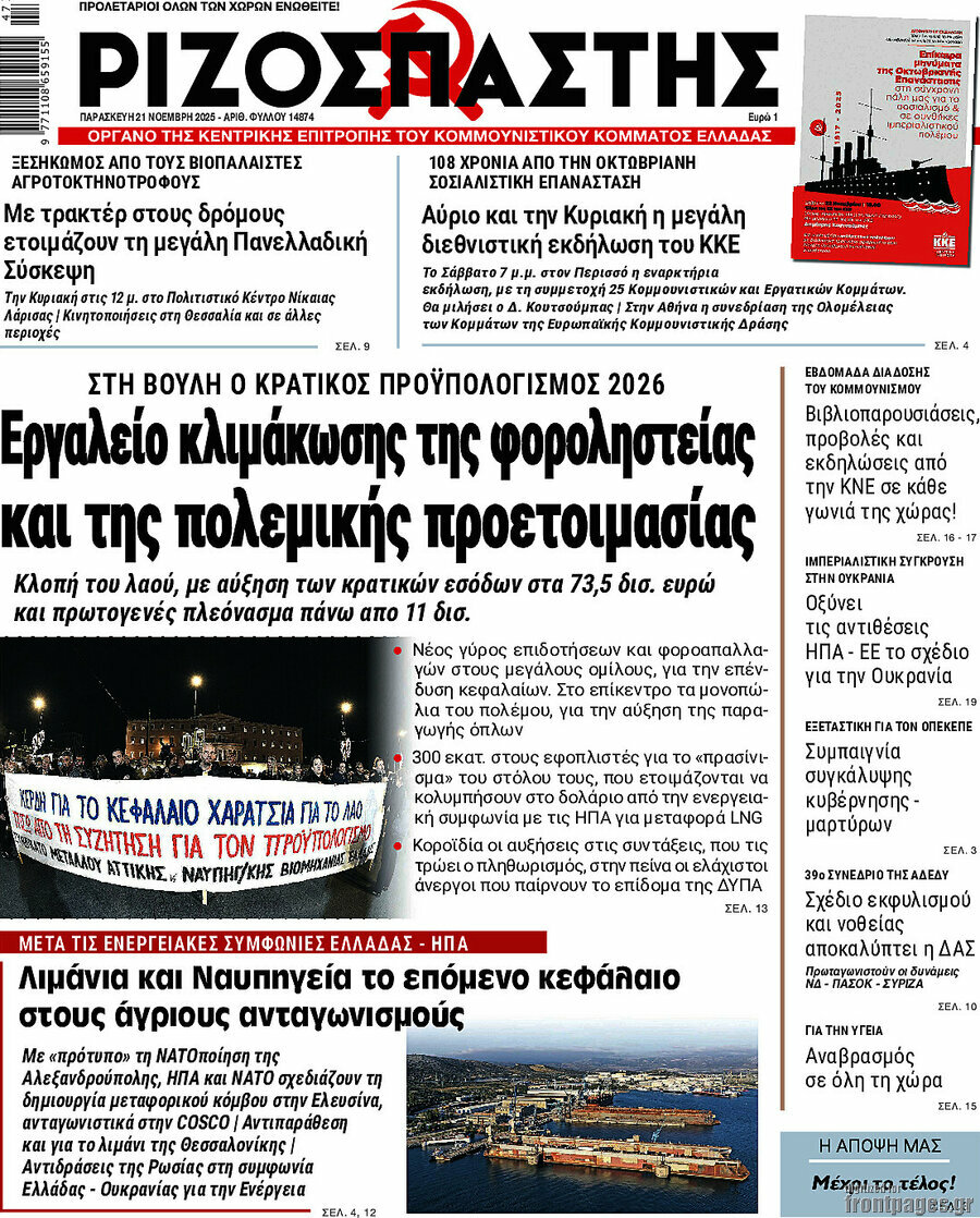 RIZOSPASTIS: State budget 2026 is a tool escalating the tax-heist and war preparations